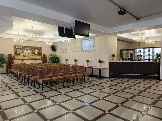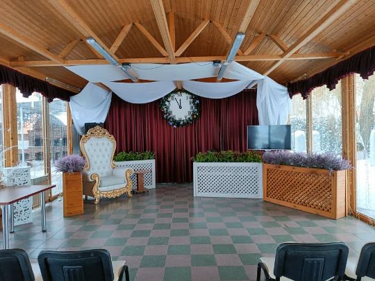 Оборудование: сцена, мягкая мебель, столы, микшер, микрофон, три телевизионные панели, есть программа для караоке.